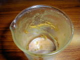 | 1.ガラス・陶器類 ビーカーにカレーが付着しております。このビーカーを40℃のお湯の入った超音波洗浄機に入れると、2分ほどできれいにカレーを落とすことができます。更に中性洗剤を加えると、超音波の効果により水中に溶け出したカレーがビーカーに再付着しにくくなりますのでいっそう効果的です。 試験機材などの洗浄に超音波洗浄は欠かせないものになっております。 |
